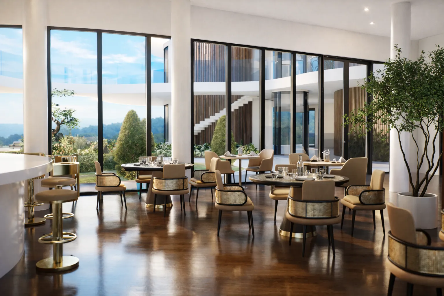 The architecture is defined by fluid forms, open layouts, and a strong indoor-outdoor connection. Large openings, terraces, and panoramic views create a continuous dialogue between interior spaces and the surrounding landscape.