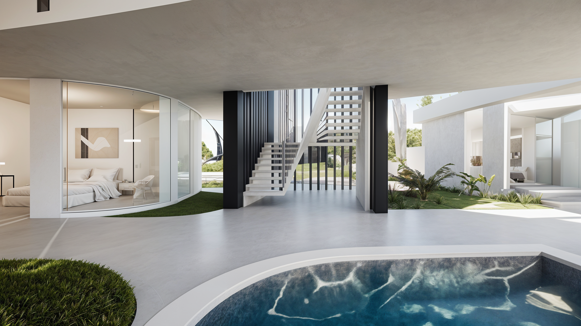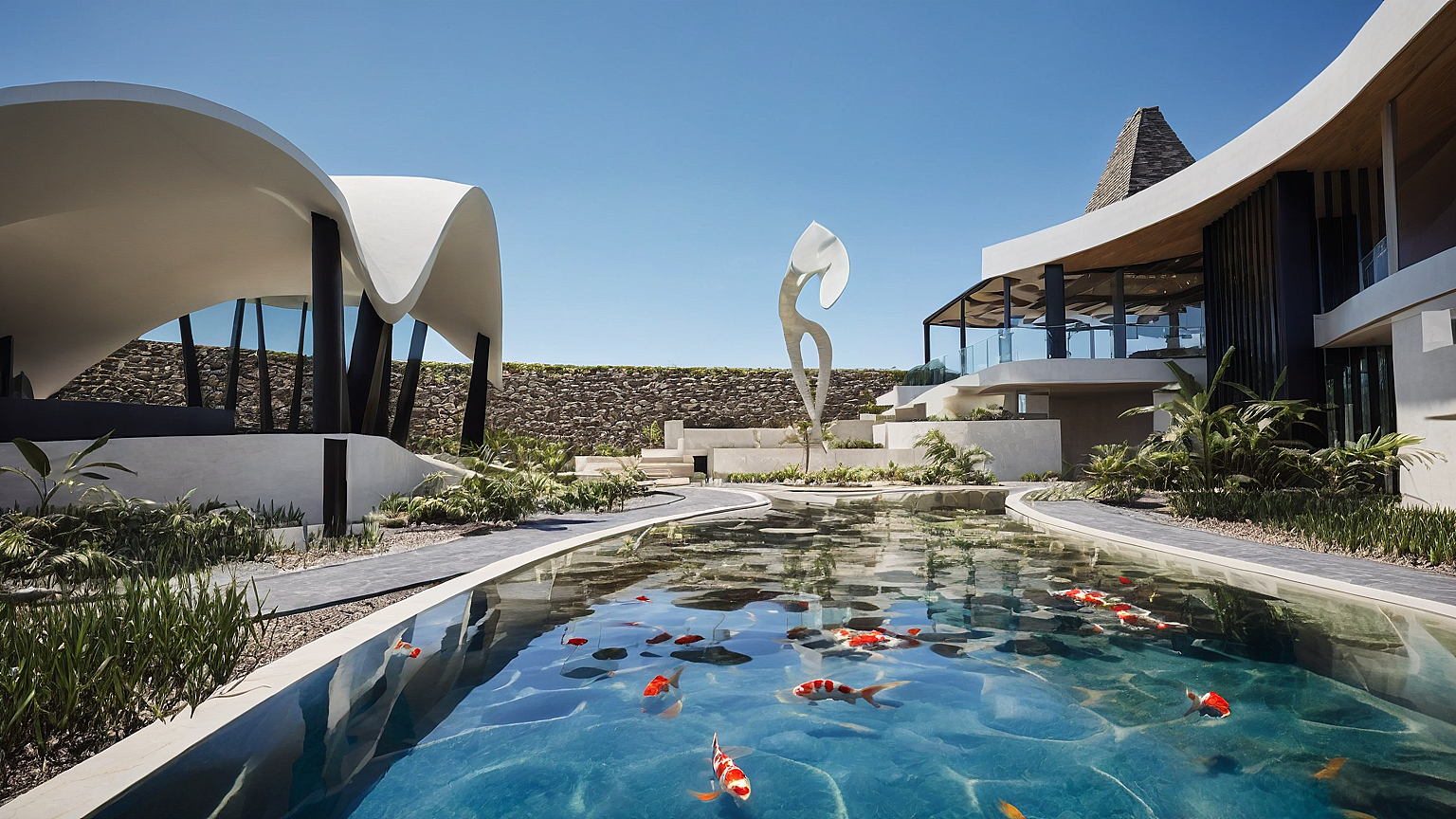 The architecture emphasizes passive design strategies, with cross-ventilation, shaded terraces, and carefully oriented spaces that respond to sun and wind. Water elements and the infinity pool extend the living spaces outward, reinforcing a continuous dialogue between architecture, horizon, and ocean.