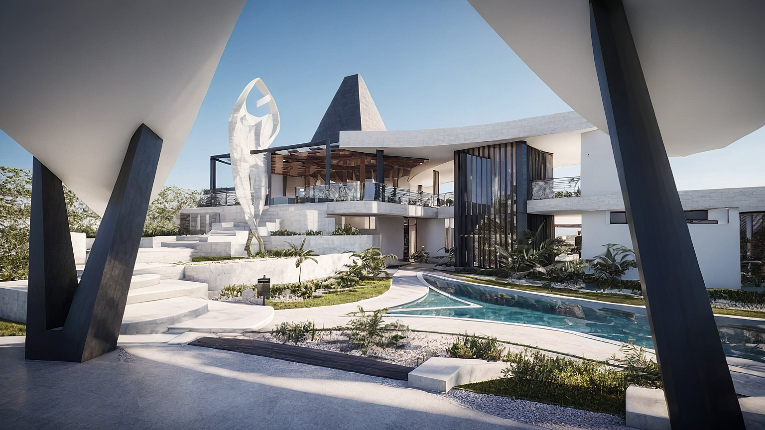 A defining feature of the composition is the central vertical element, inspired by traditional Sumbanese towers, which acts as both a symbolic and spatial anchor. Around it, the villa unfolds with clean lines and generous overhangs, offering protection from the tropical climate while maintaining openness and transparency.