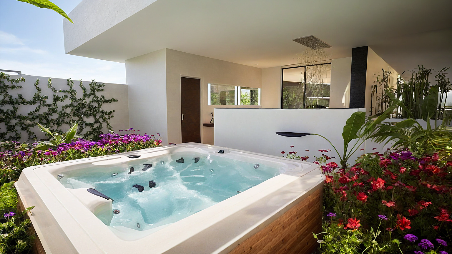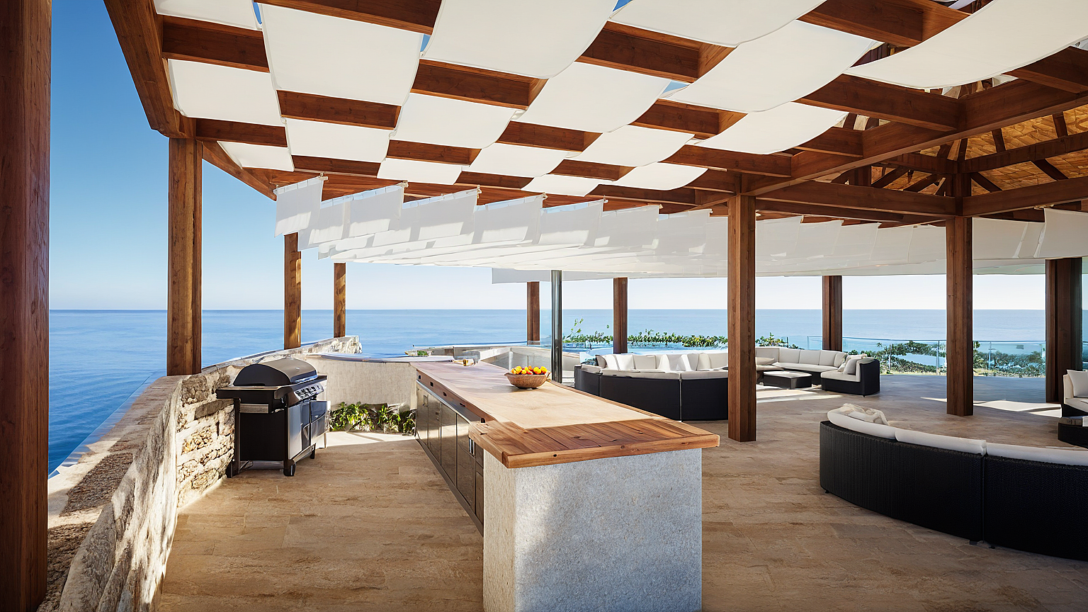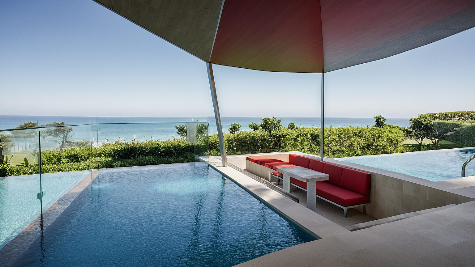 The architecture emphasizes passive design strategies, with cross-ventilation, shaded terraces, and carefully oriented spaces that respond to sun and wind. Water elements and the infinity pool extend the living spaces outward, reinforcing a continuous dialogue between architecture, horizon, and ocean.